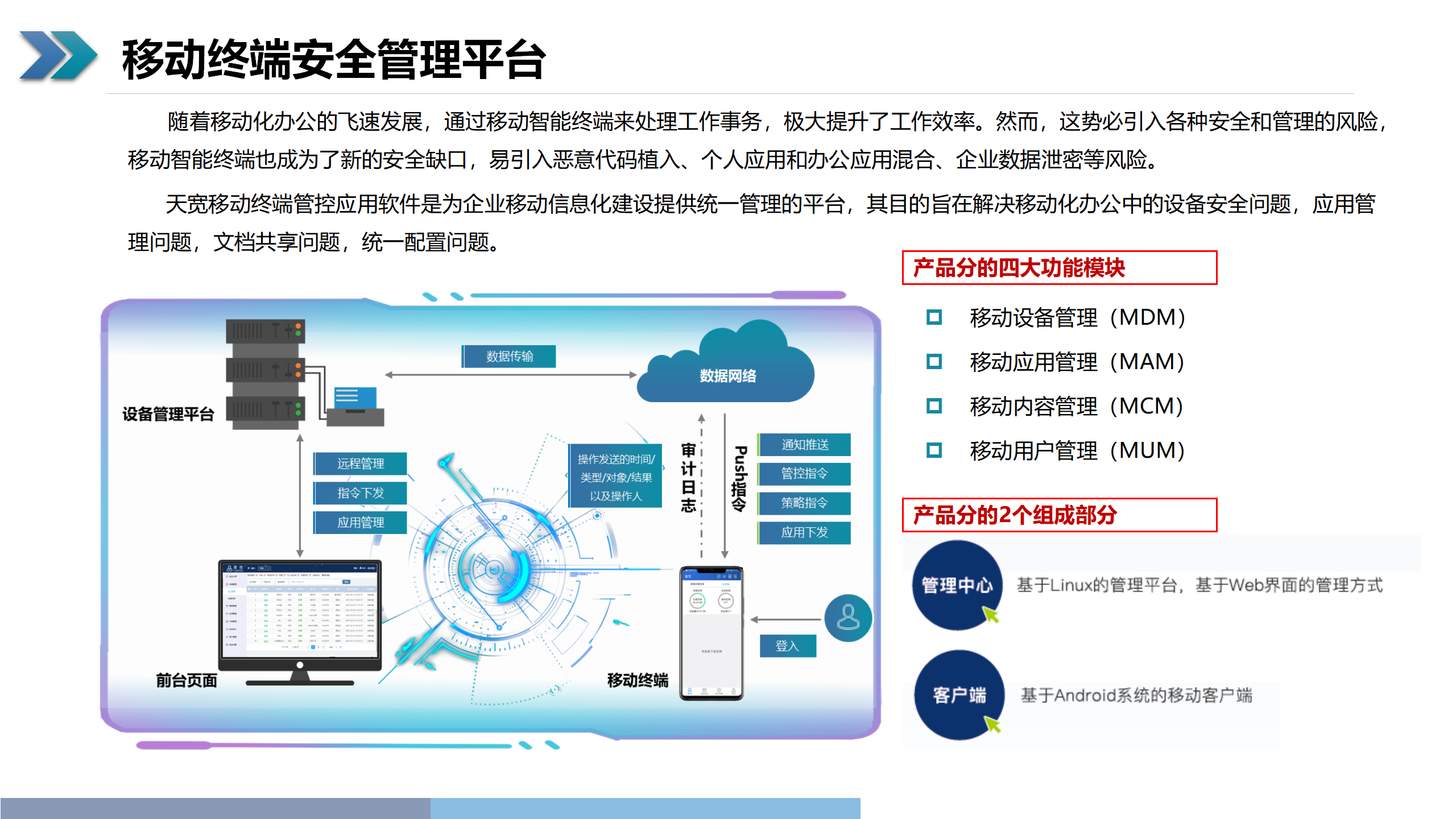 天寬移動(dòng)終端安全管理平臺(tái)是為企業(yè)移動(dòng)信息化建設(shè)提供的統(tǒng)一管理平臺(tái),旨在解決移動(dòng)化辦公中的設(shè)備安全問題、應(yīng)用管理問題、文檔共享問題、統(tǒng)一配置問題等,保證移動(dòng)設(shè)備使用的安全合規(guī)性,依托后臺(tái)服務(wù)器對(duì)相關(guān)賬號(hào)的注冊(cè)、激活進(jìn)行管理,通過終端環(huán)境等多方協(xié)同的安全管理技術(shù)、防護(hù)機(jī)制等手段,加強(qiáng)對(duì)移動(dòng)智能終端應(yīng)用程序的掌控和對(duì)惡意應(yīng)用及行為的責(zé)任追究能力,建立更加安全可控的移動(dòng)終端應(yīng)用環(huán)境。