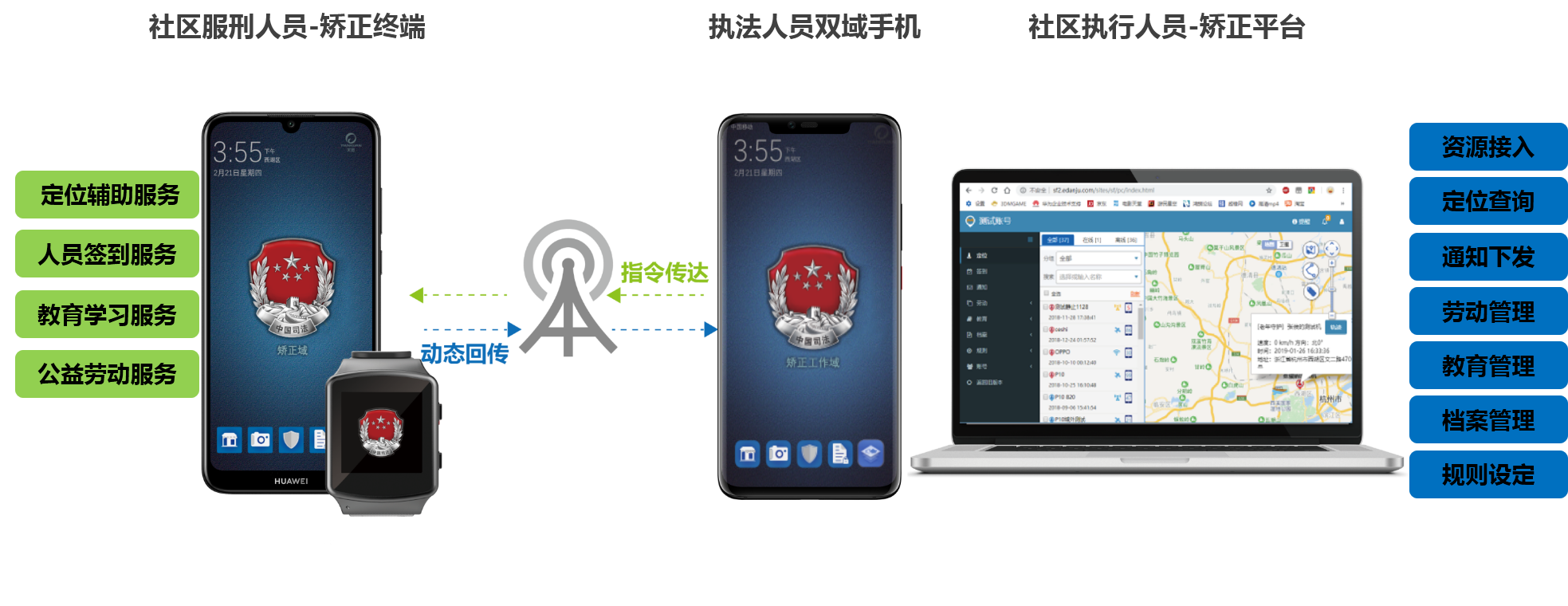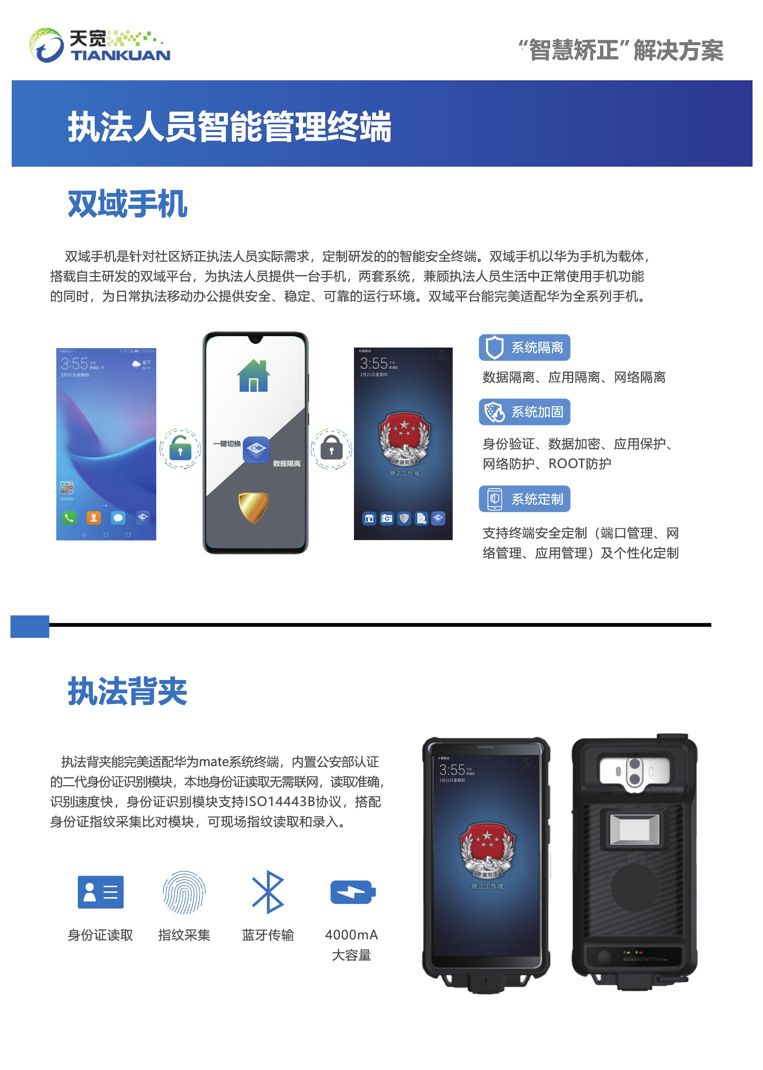 天寬“智慧矯正”移動(dòng)終端解決方案以華為智能手機(jī)為載體,搭載自主研發(fā)的“安全域” 平臺(tái),為社區(qū)服刑人員、執(zhí)法人員提供軟件應(yīng)用的安全環(huán)境、一機(jī)兩用、保證矯正效果的同時(shí)不影響生活中正常使用手機(jī)功能。個(gè)人裝備類整體解決方案包括內(nèi)容有電子腕帶、社區(qū)服刑人員專用終端、以及執(zhí)法人員使用的執(zhí)法終端。